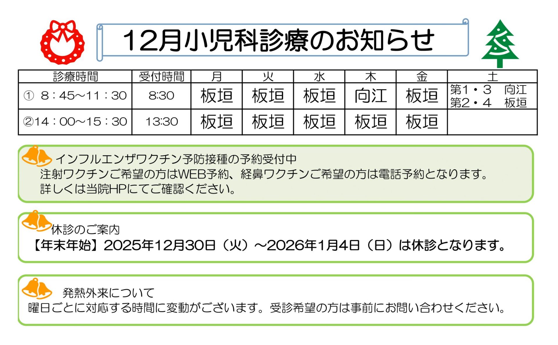 2025年(令和7年)12月の小児科体制は以下の予定です。