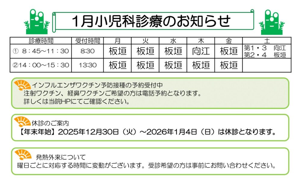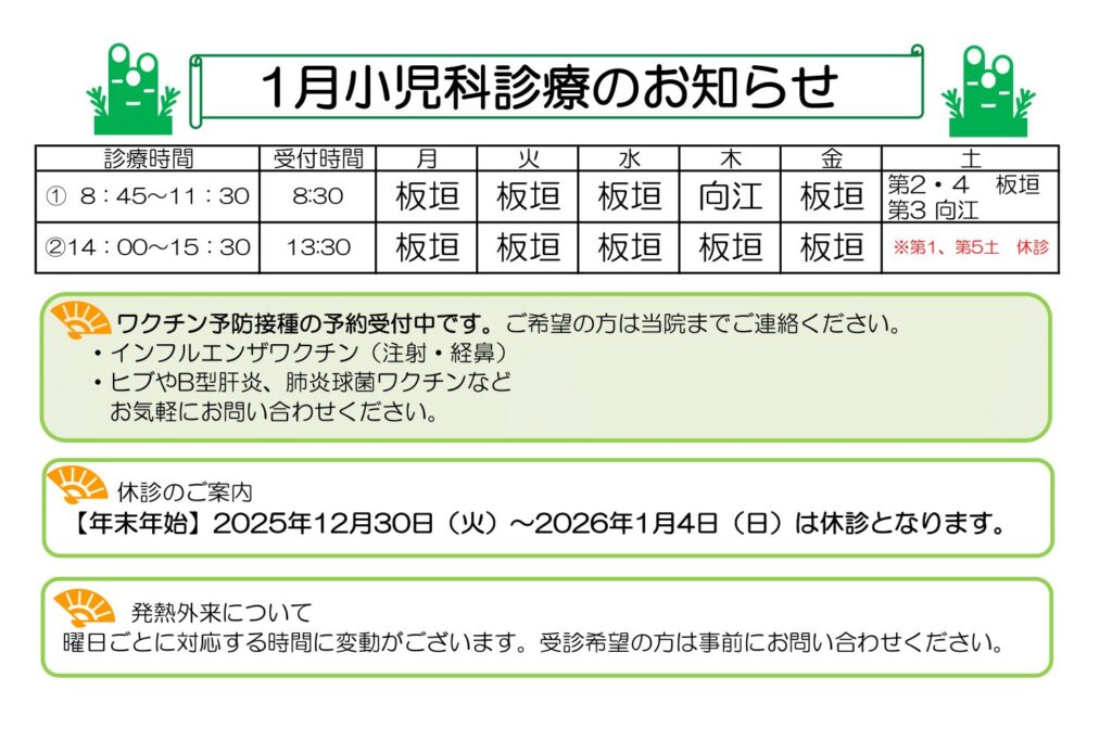 2026年(令和8年)1月の小児科体制は以下の予定です。