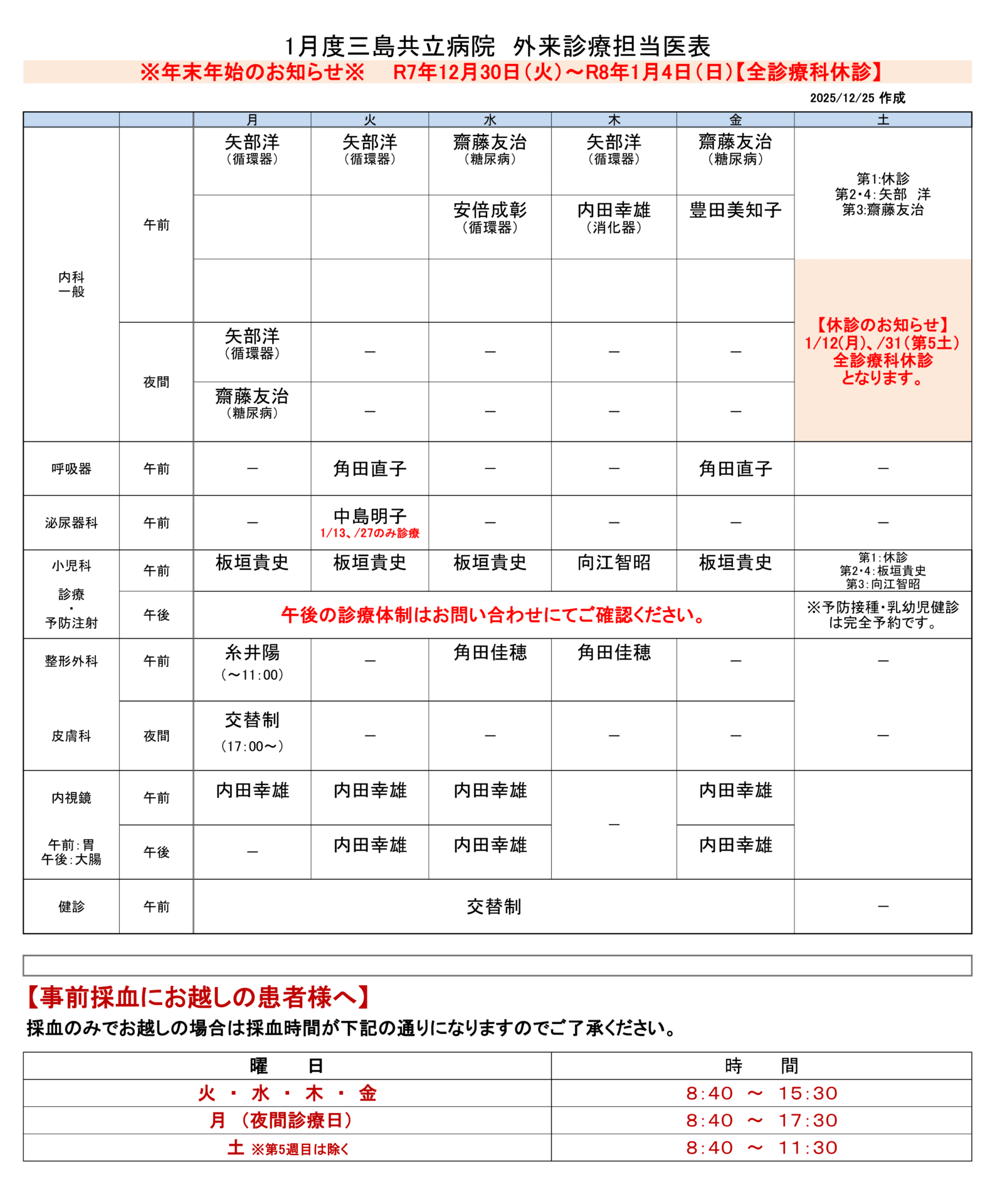 2026年(令和8年)1月の外来診療体制は以下の予定です。