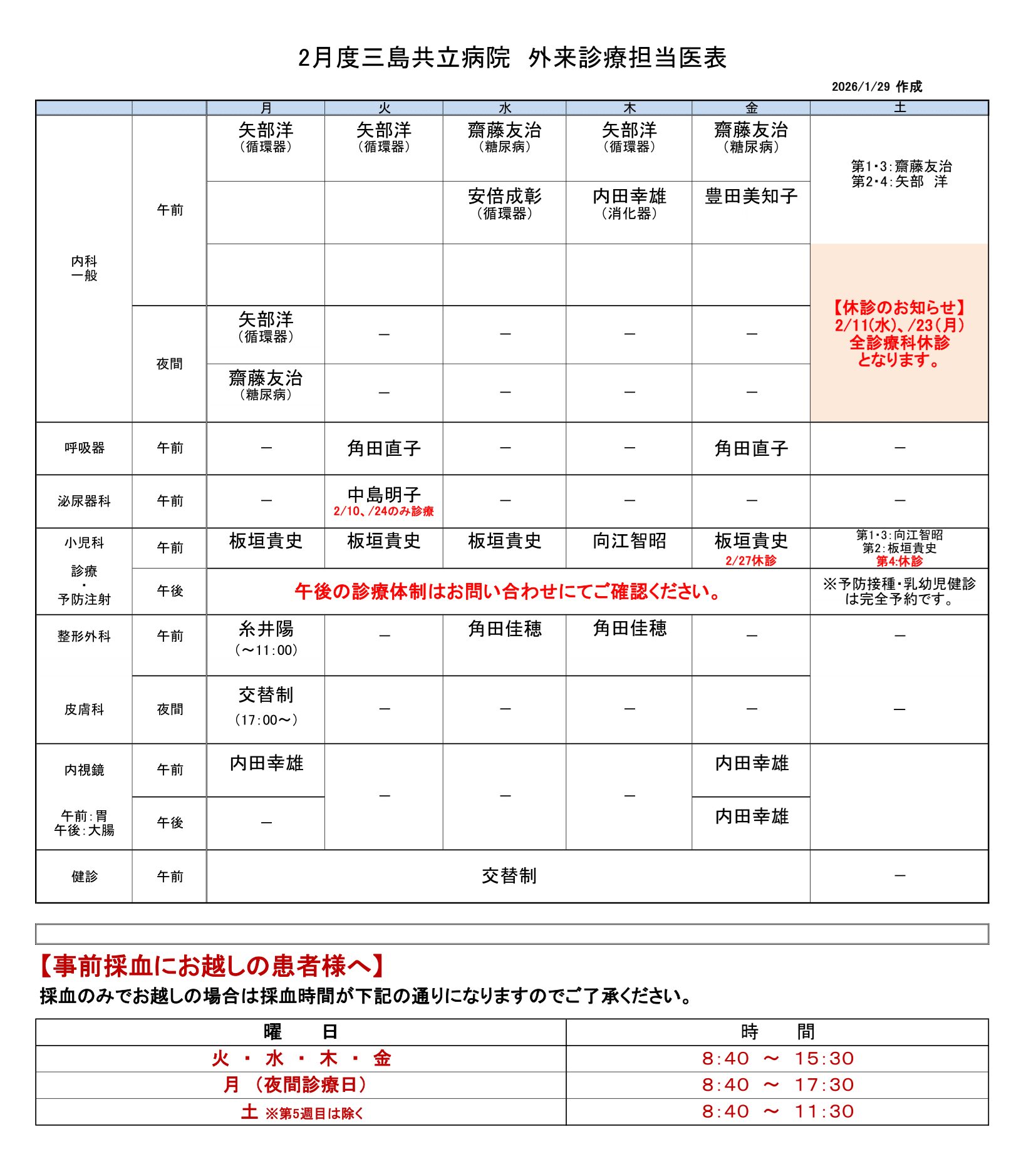 2026年(令和8年)2月の外来診療体制は以下の予定です。