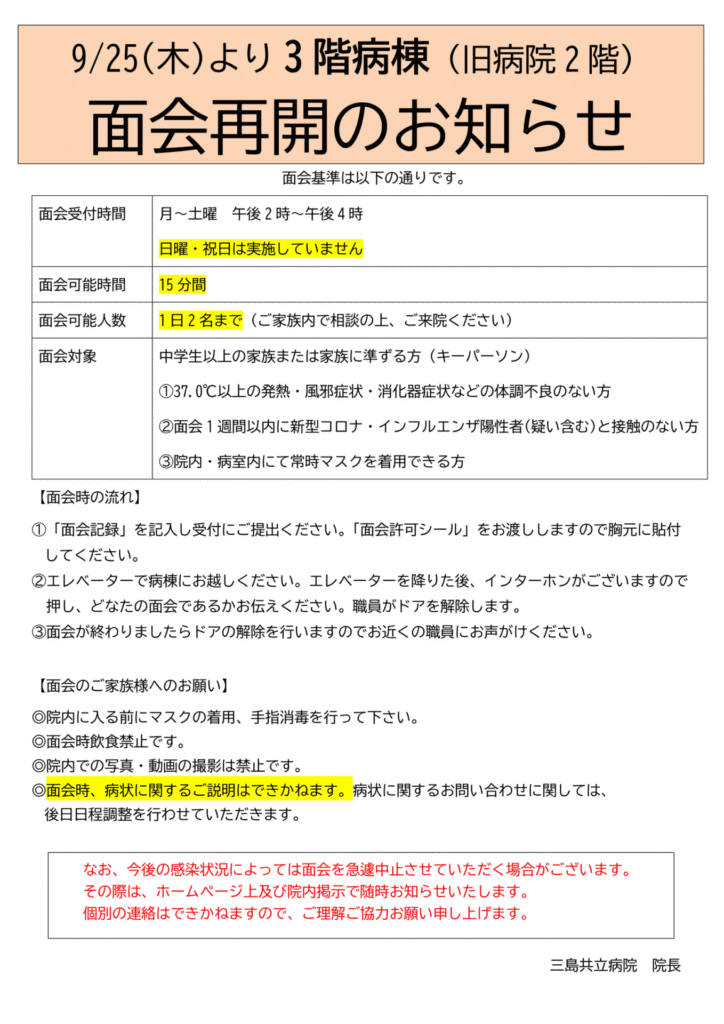 9月25日(木)より3階病棟(旧病院2階)面会を再開いたします。